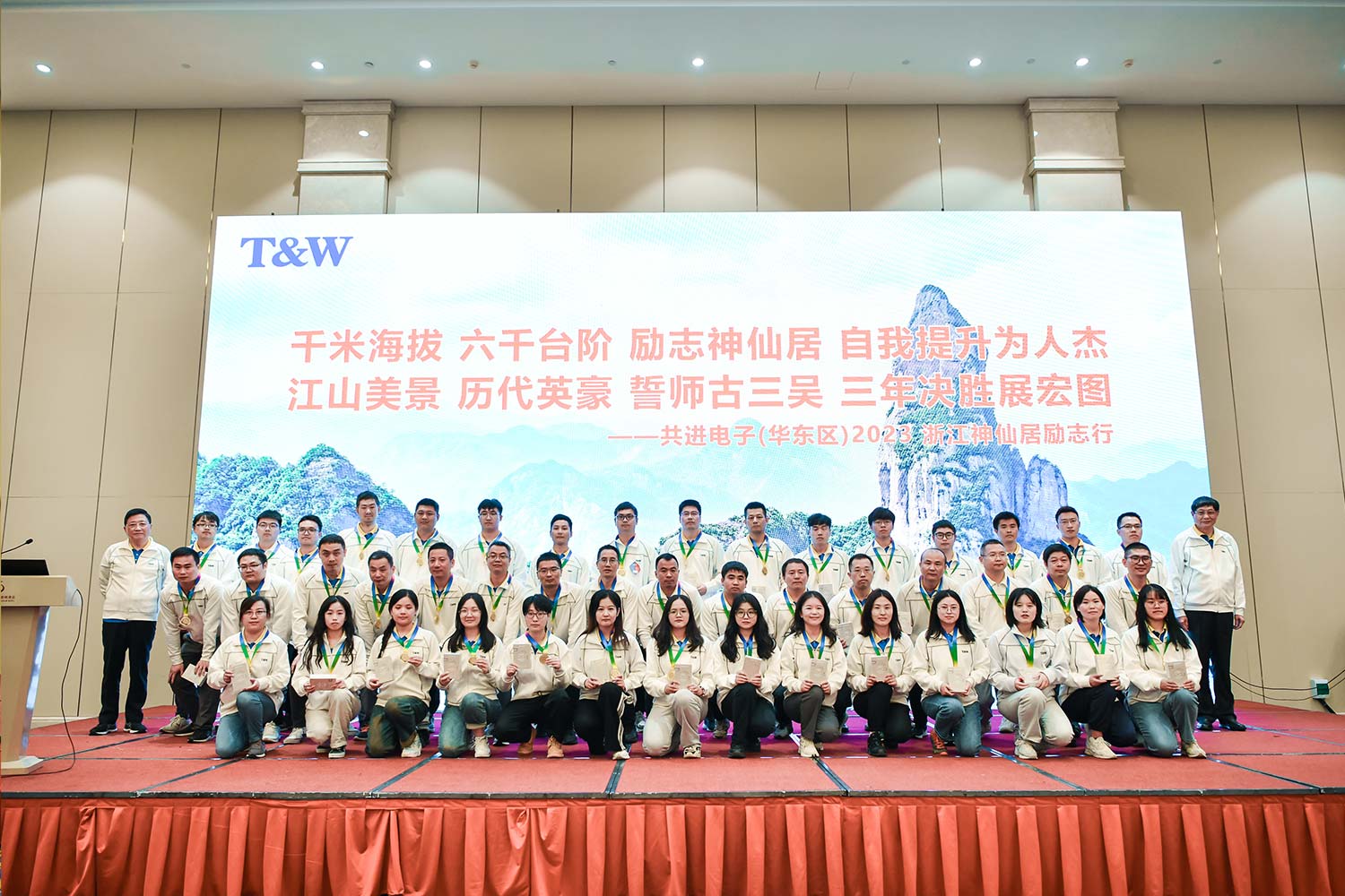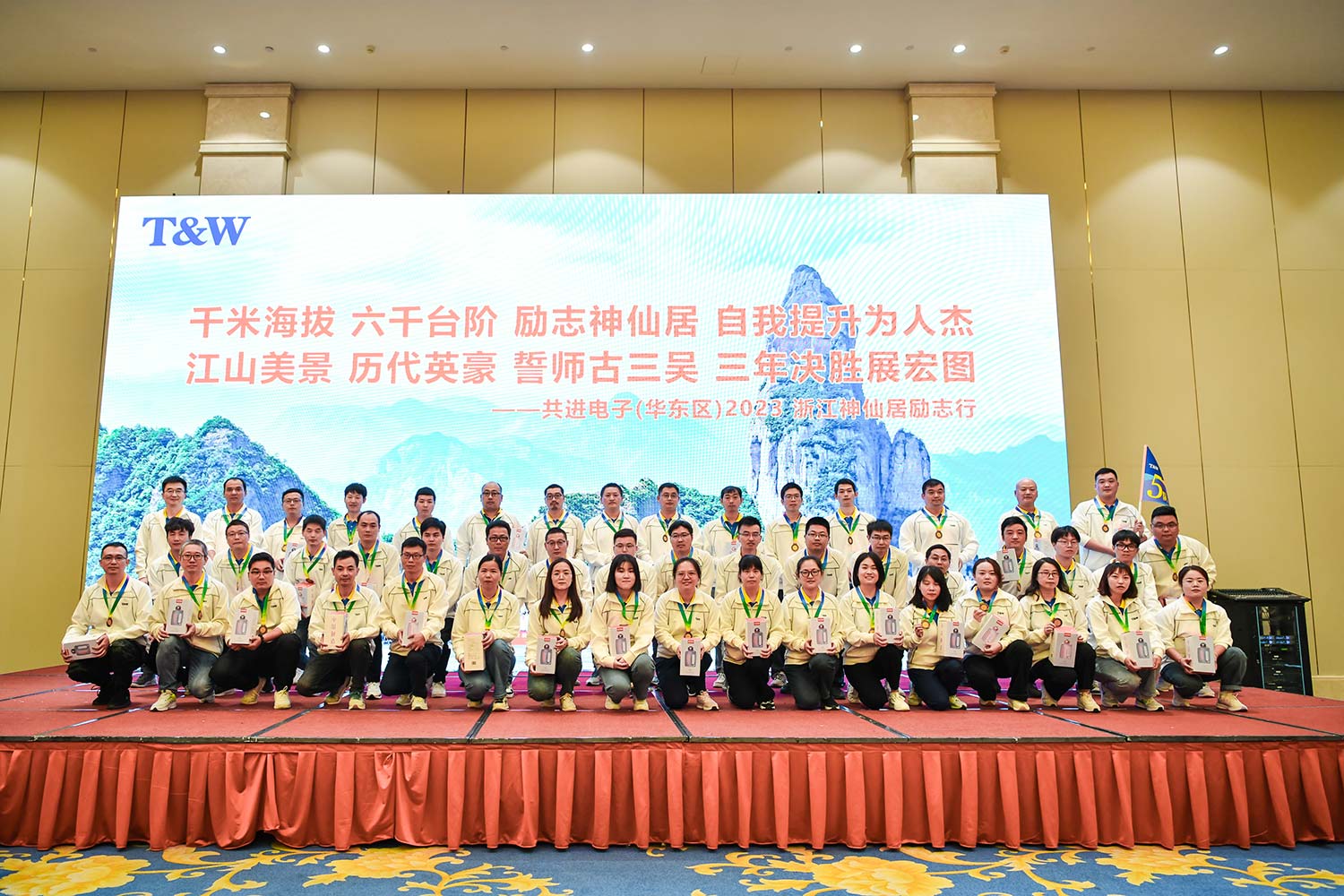 江山美景,历代英豪,誓师古三吴,三年决胜展宏图。10月15日上午,员工们游览绍兴古城名胜。中午12时,公司在绍兴富悦温德姆酒店隆重召开2023浙江神仙居励志行表彰暨下半年动员大会。在欣赏完励志行回顾视频后,人力行政管理中心总经理谌凯做活动总结,分享此次励志行重要数据,全员登顶平均用时1小时22分,其中登高男子个人冠军为3队黄江,用时38分1秒;女子个人冠军为2队晏秋兰,用时50分51秒。