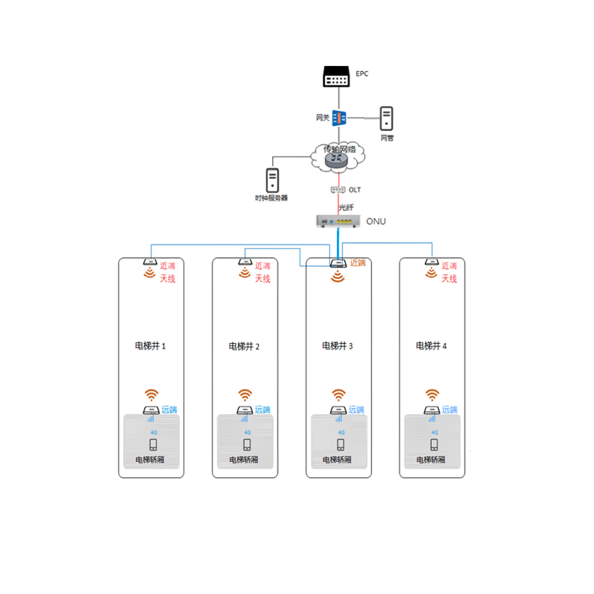 通过安装在电梯井顶部1副5GHz WiFi天线往下覆盖电梯井。可支持通过以太网口扩展实现一拖三组网,覆盖3部电梯,近端集成5GHz WiFi网桥和路由,ONU(可选)功能。